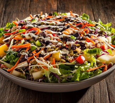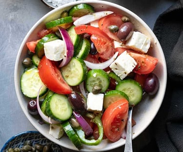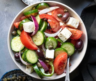 A balanced combination of sliced cucumbers, tomatoes, green bell pepper, red onion, olives, and feta cheese Dressed with Olive Oil, Salt, Vinegar and Spices. (6P)