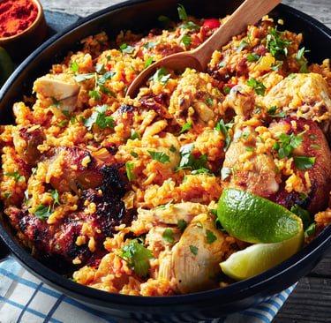 Sautee Chicken and Pork on a bed of Valencia style rice cooked with a chicken stew with Onions, peppers and green peas.